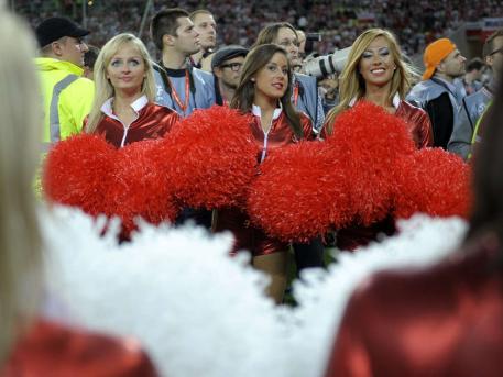 Cheerleaders providing entertainment at the Germany vs. Poland soccer friendly ahead of next years european championchips.
