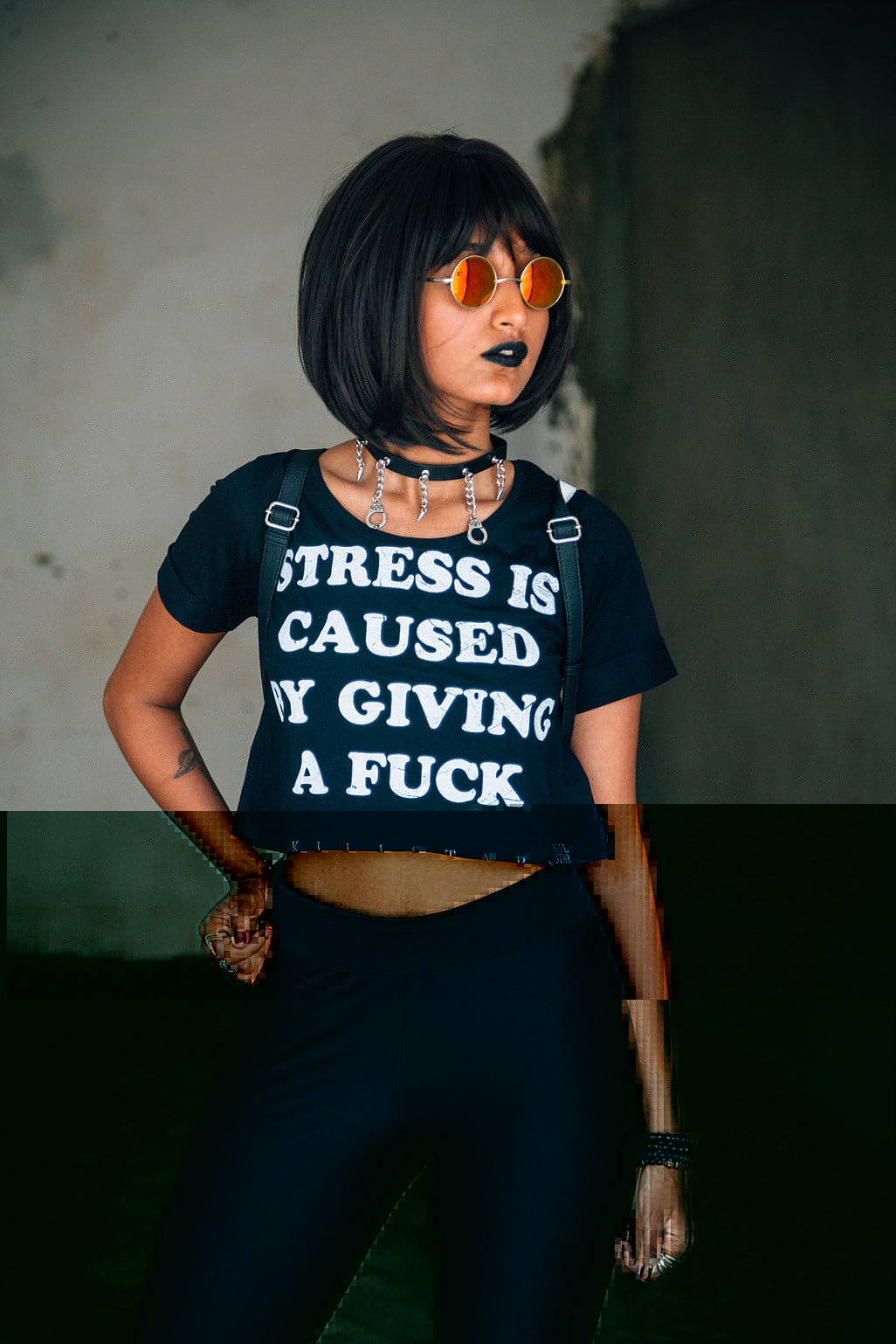 "Sandra T came with her amazing goth outfit. Her new video is kind of video which you can’t stop watching. She is wearing crop top from Killstar with printed text., black fitted leggings from Garage"