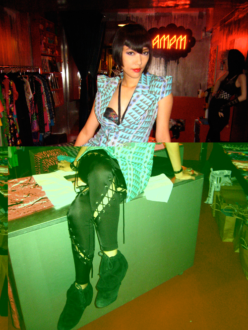 [the thick 'fishnets' are: 'From everyone's favorite fashion sister act, Kate and Laura Mulleavy of Rodarte bring us these leather leggings that are so much more than a diamond in the rough... These laser cut leather thigh high leggings are hand crafted with a zipper in the back for a precise fit. available in black, white, and tan.' retail price $920. Even rihana wears them http://www.flickr.com/photos/outsapop/3806137213/ ]