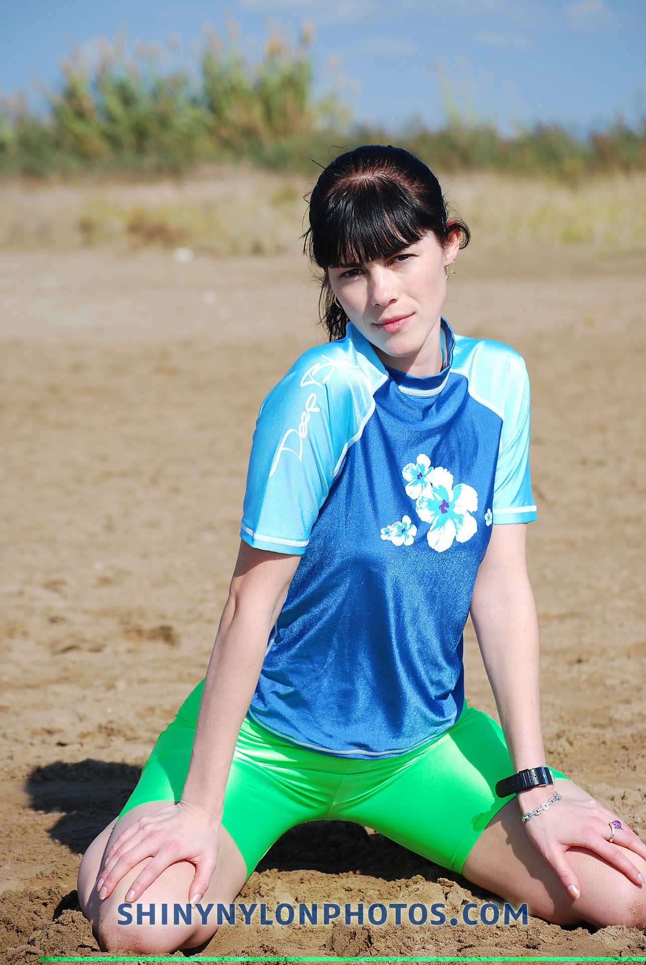 I have just added a new photoset to my web shininylonphotos.com, with a cute girl wearing a light green spandex shorts and a light blue spandex top.